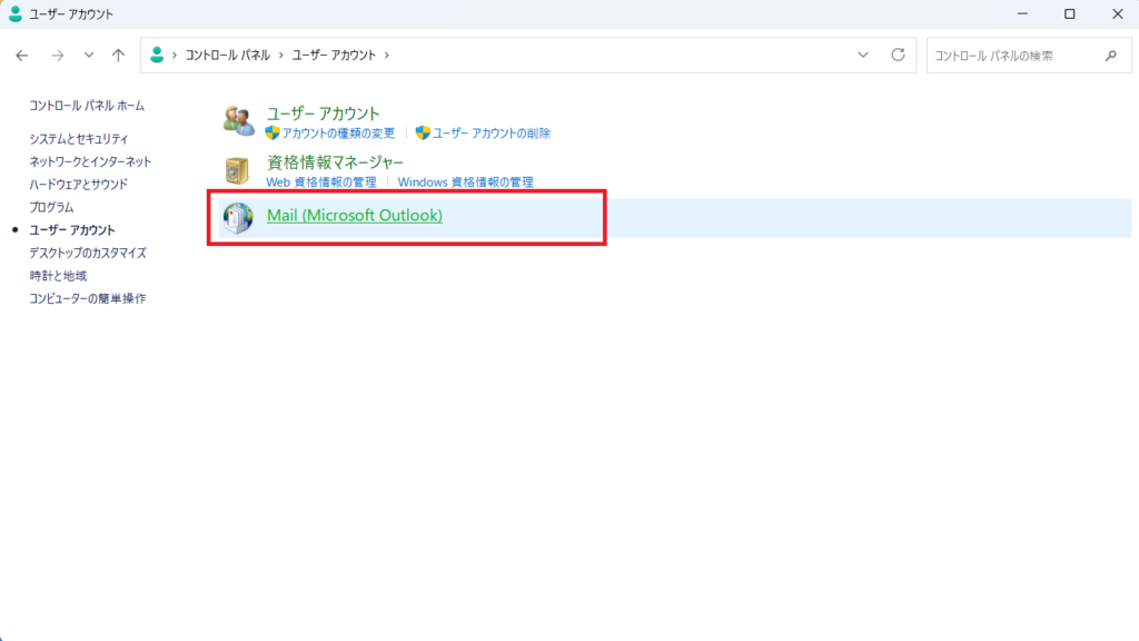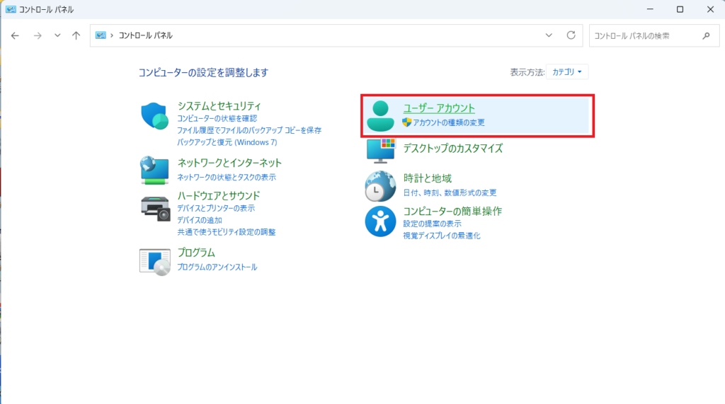 1.コントロールパネルのユーザーアカウントをクリック