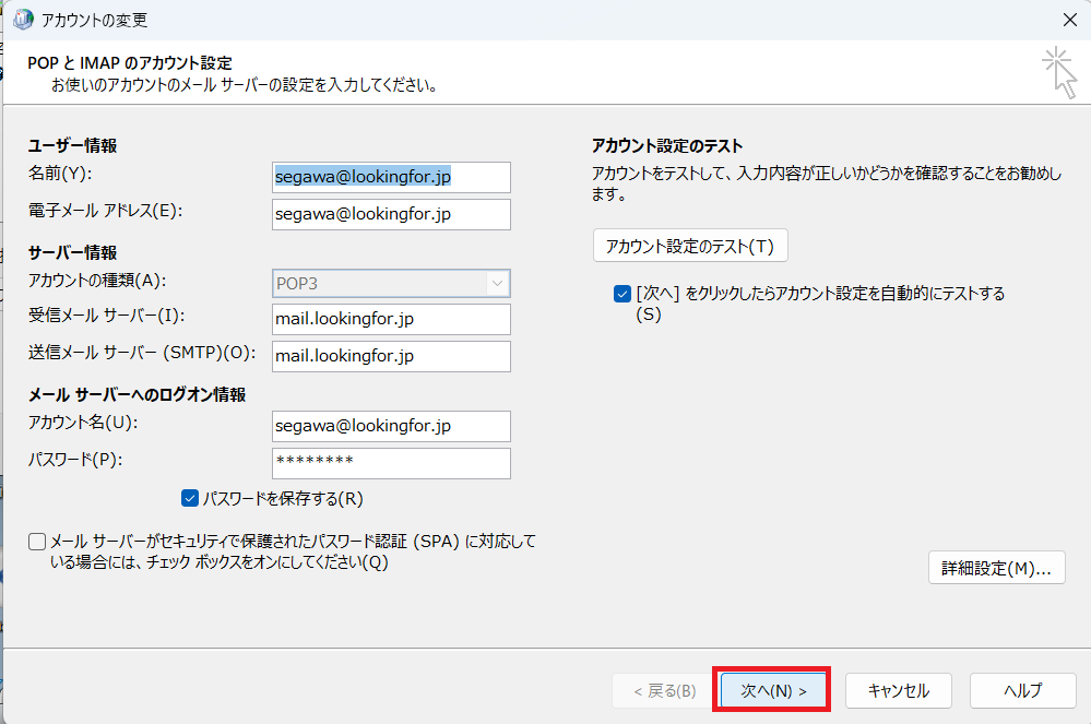 7.「POPまたはIMAP」にチェックをして、「次へ」をクリック