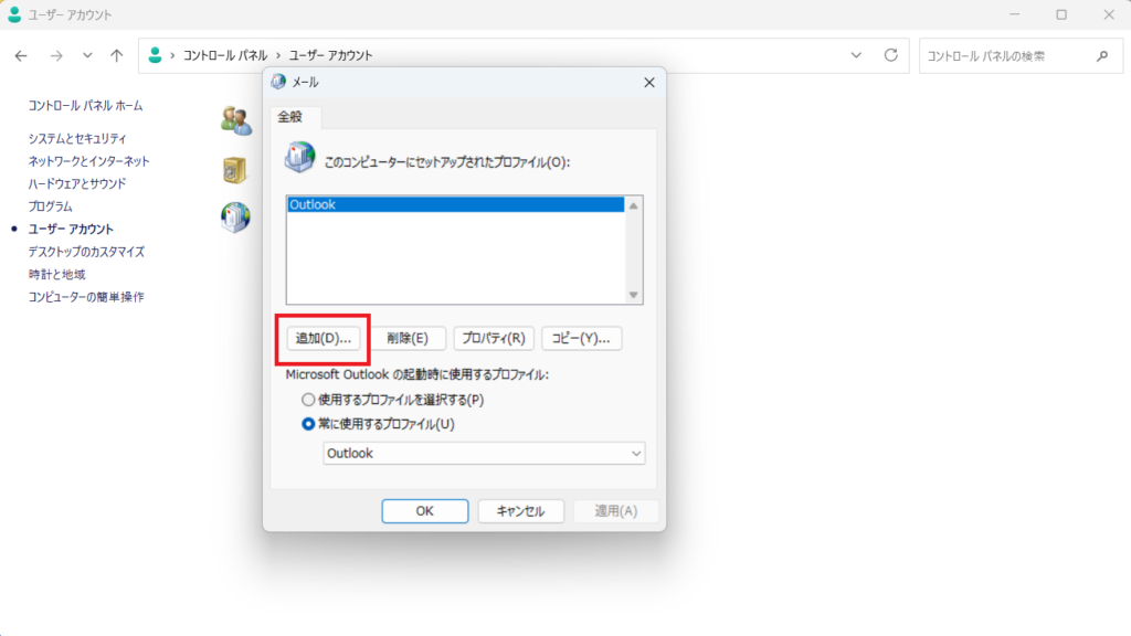 メール設定(Outlook は 必ず終了 しておく)